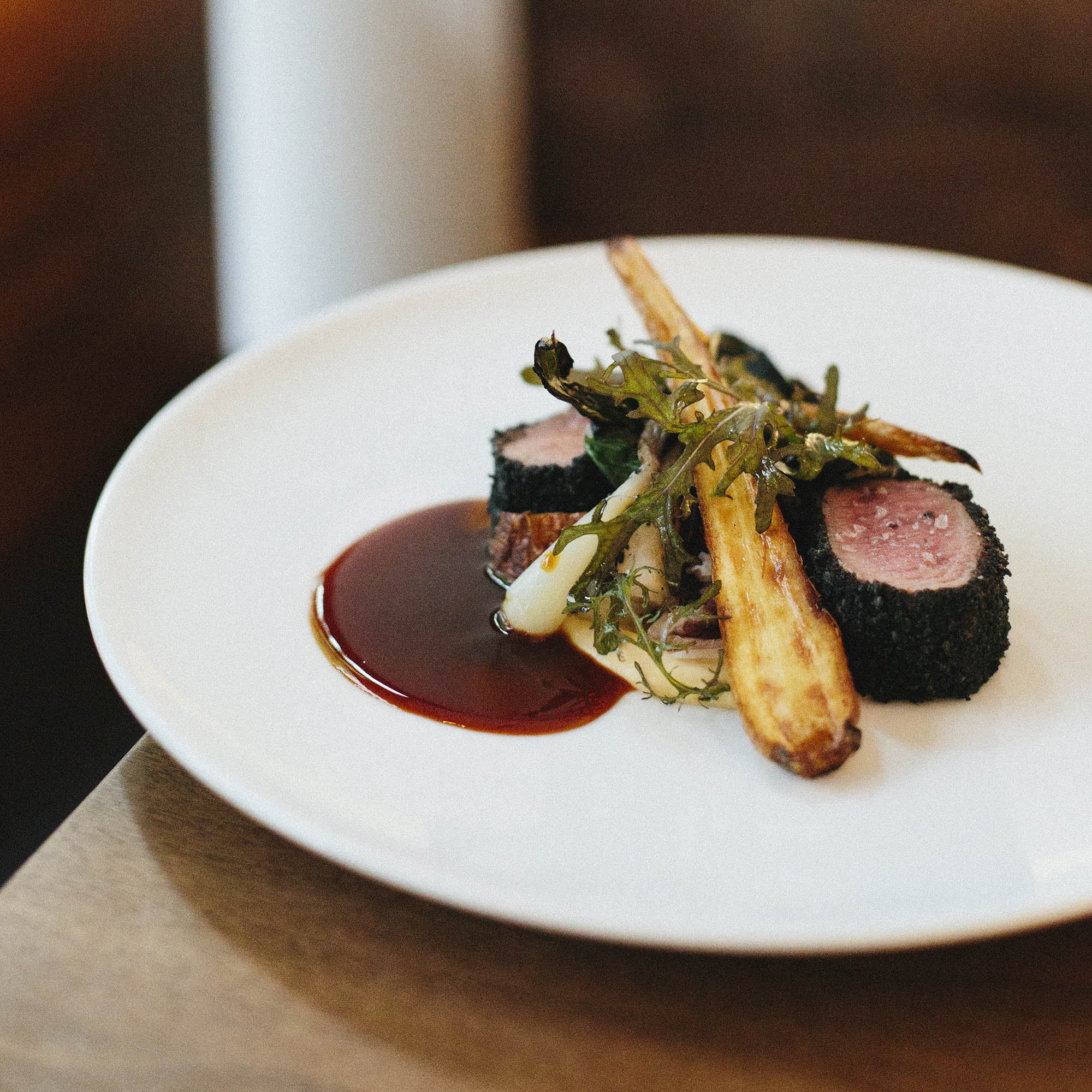 Hjort med potatiskaka,trattkantarellsås, sotad lök, smörslungade sockerärtor & syrade lingon